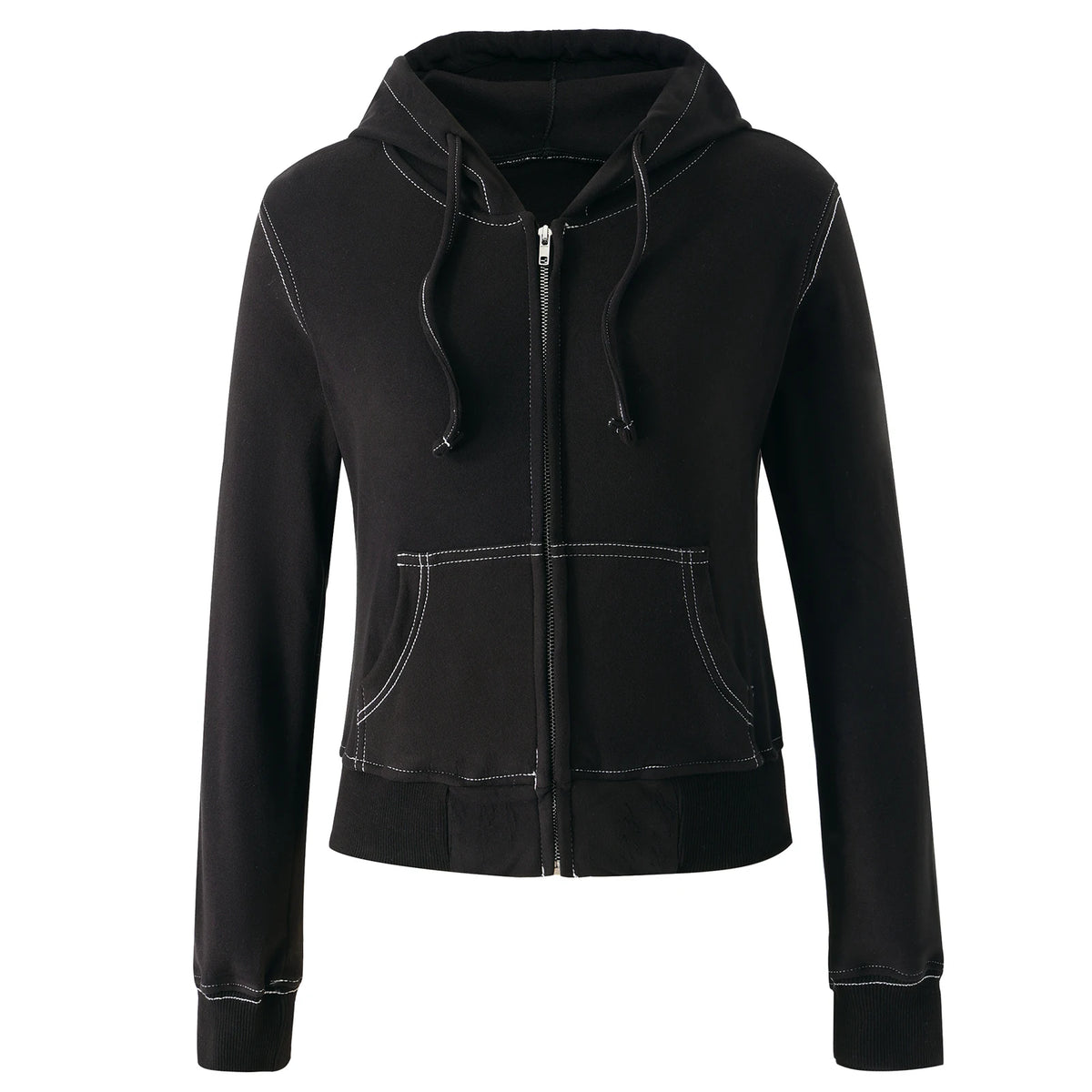 Women Casual Vintage Hoodies Personalized Sewing Thread Long Sleeve Zipper Hooded Sweatshirt with Pockets